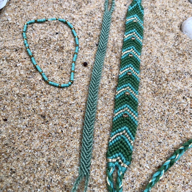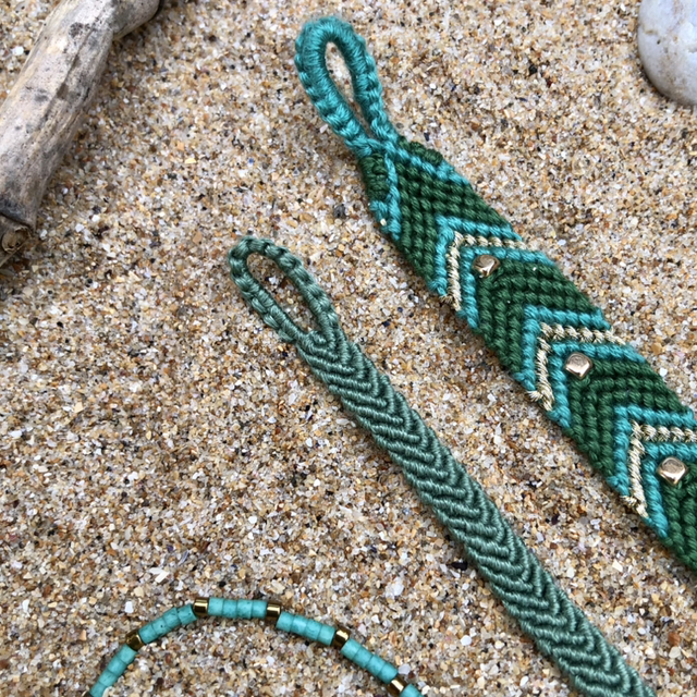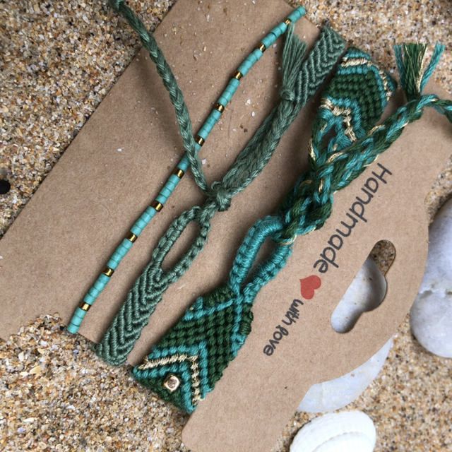 2 bracelets en fil de coton, taille reglable, facile à nouer et à dénouer grâce à l’embout tissé en forme de boucle + 1 bracelet élastique en perles.