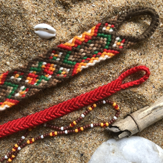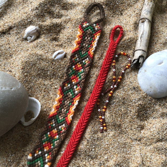 2 bracelets en fil de coton, taille reglable, facile à nouer et à dénouer grâce à l’embout tissé en forme de boucle + 1 bracelet élastique en perles.