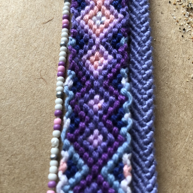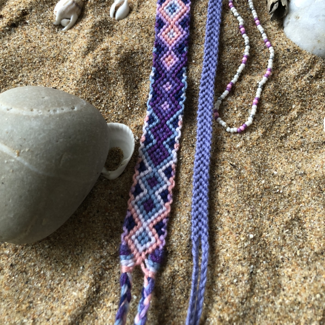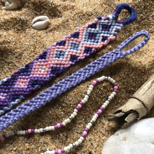 2 bracelets en fil de coton, taille reglable, facile à nouer et à dénouer grâce à l’embout tissé en forme de boucle + 1 bracelet élastique en perles.