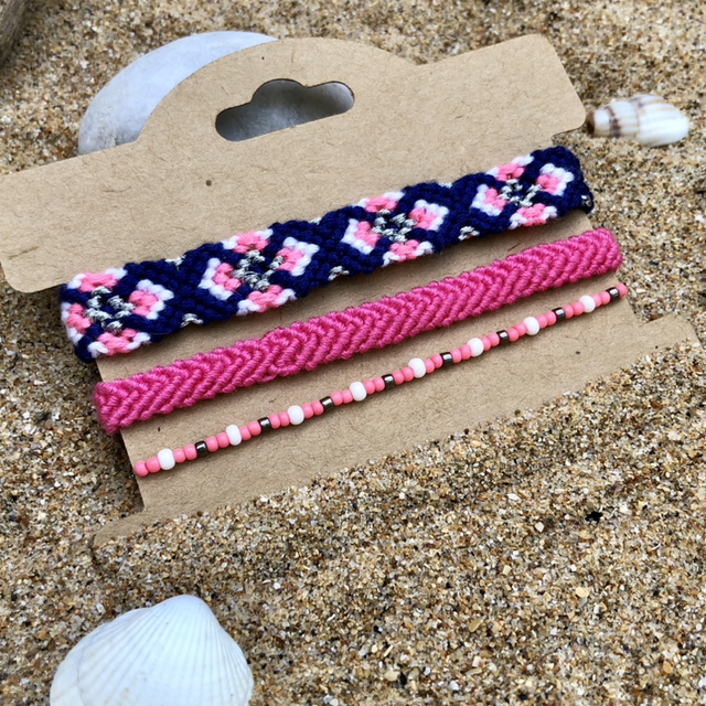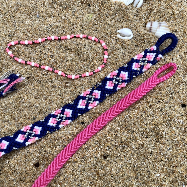2 Bracelets en fil de coton faciles à nouet et débouer grâce au tissage de l’embout en forme de boucle + bracelet de perles elastique.